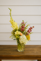 Each design includes approximately six focal blooms with accent flowers, artfully arranged in a timeless glass vase for a fresh, gathered-from-the-garden look. Exact flower varieties and colors will vary with the season, making every arrangement unique and one-of-a-kind.