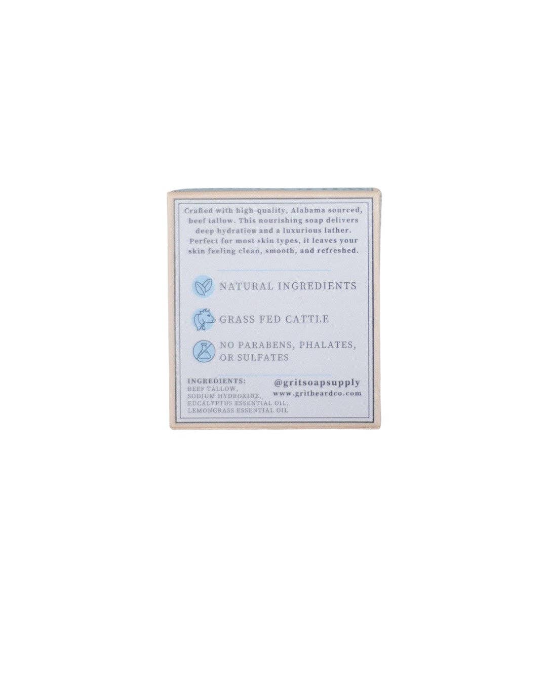 Ingredients: Beef Tallow, Eucalyptus Essential Oil, Lemongrass Essential Oil, Sodium Hydroxide (Lye)