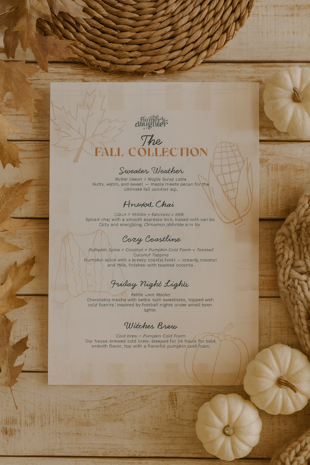 Each drink in the collection is more than a recipe — it’s a story in a cup. Sweater Weather wraps you in comfort with notes of butter pecan and maple, a nod to the sweetness of slowing down. Harvest Chai brings together spiced chai and espresso, giving you that burst of energy that mirrors long days of gathering the season’s bounty. Cozy Coastline pairs pumpkin spice with coconut, inspired by the balance of tradition with a little unexpected adventure - oh and that one time The Farmer’s Daughter lived on the coast!. Friday Night Lights captures the nostalgia of small-town football games with the sweetness of kettle corn. And Witches Brew is a bold, smooth cold brew with pumpkin foam — a playful tribute to the season’s spirit and mystery.